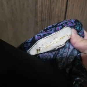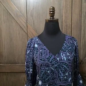 jens pirate booty dress with a vibrant purple and blue pattern. Features a V-neck and three-quarter sleeves. size medium. excellent condition.