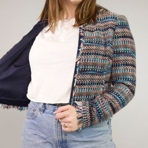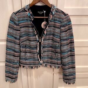 Juicy Couture Black Label fun colorful zip up blazer. Fully lined. Fringe edge detail. JC zipper pull. Fully lined in silk. Excellent condition!