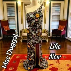 Stunning one-shoulder dress with floral design. Features a daring high slit and backless cutout dress. Sparkly sequins, high-end design, like new.