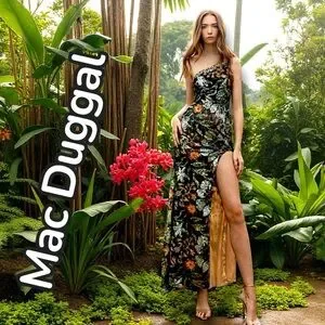 Mac Duggal Green, Black and Orange Tropical and Floral Sequin, Backless Dress