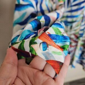 This is a long sleeved dress by Boston Proper. It features multicolored tropical plant print. On the back is a zipper with a hidden inner clasp, and each cuff has a button closure.