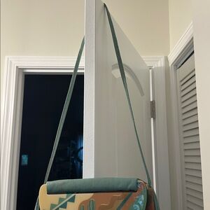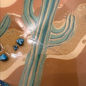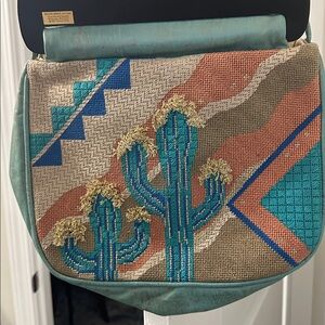 Unique handbag with a colorful Southwestern cactus design. Features shades of teal, orange, and tan.