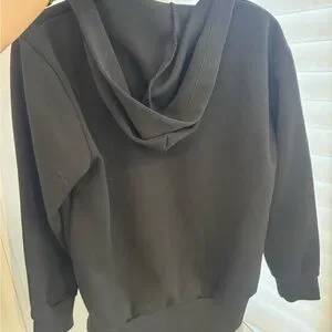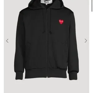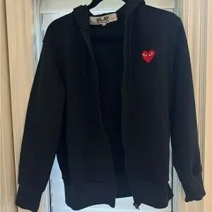 Stylish black hoodie featuring a red heart patch. Perfect for casual wear.