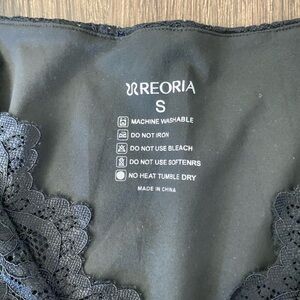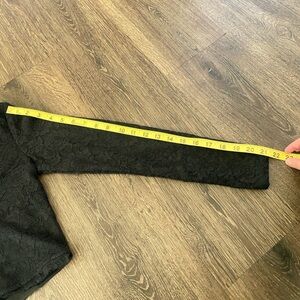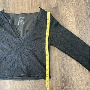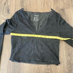 Black lacey deep v-neck long sleeve top with lace overlay and lace trim. Size small.