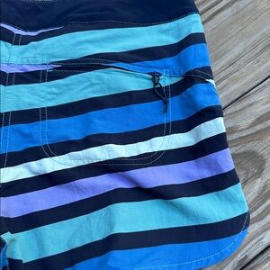NWT Patagonia Wavefarer Blue Striped Board Shorts Swim Zip-Pocket Tie Front Size 6