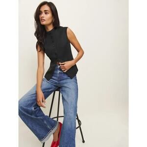 Reformation Lottie Vest in Black. Size S / Small. Features fitted, lightweight woven suiting fabrication, round neckline, button front closures, sleeveless. 100% tencel lyocell. NWT / New with tags. *Please note there is a small hole next to one of the buttons as photographed.