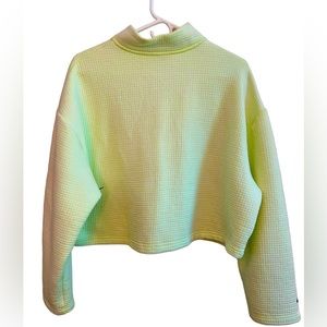 Nike size M women’s tech fleece matching set. Set comes with the tech fleece 1/4” zip crop pull over and loose fit tech fleece pants. Both pieces are in the color Vapor. The pictures don’t do this color justice! The color is a light but vibrant lime green. Measurements are 18 inches in total length in 14” zip and pit to pit 25 1/2 inches. Pants inseam measures 29 inches total length measures 41 1/2 inches hips measure 21 1/2 inches bottom flare measures 13 inches. Matching set is in great condition no holes and no stains.