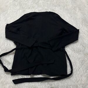Chic black cardigan with open front. Features stylish tie accents. Ideal for layering.