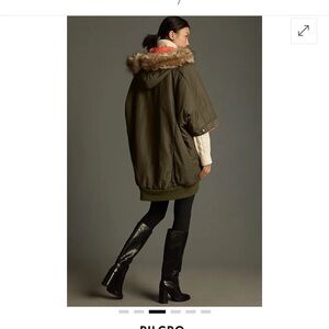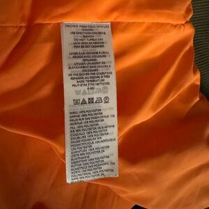 Stylish olive coat featuring faux fur accents. Vibrant orange lining for a bold touch. Very gently used.