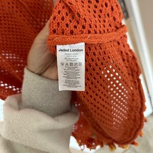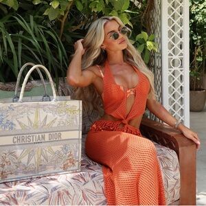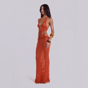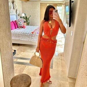 Crochet knit maxi dress with twist detail and beaded fringe detail