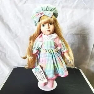 Vintage blonde porcelain doll with beautiful spring colors, very Easter-y! A bit dusty and needs some fluffing due to years in storage.