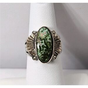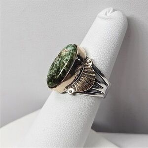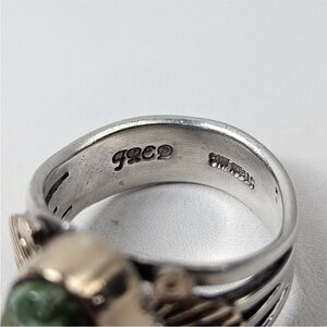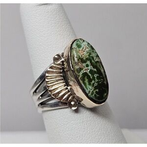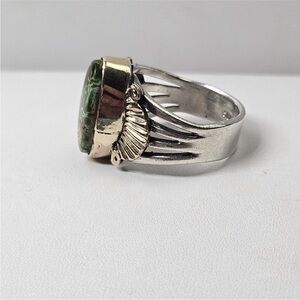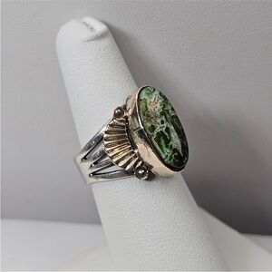 This listing is for the amazing sterling silver and gold or gold filled turquoise Ring shown in the photos. The ring is a size 6.25 and signed Fred. I'm unsure whether the bezel and decorations are solid or gold filled as they did take a good buffing without any real fill loss. The stone is absolutely exceptional and is the perfect green color with little bits of blue showing through. To me it reminds me of Damele turquoise but that is not a guarantee. It's an exceptionally well made ring.