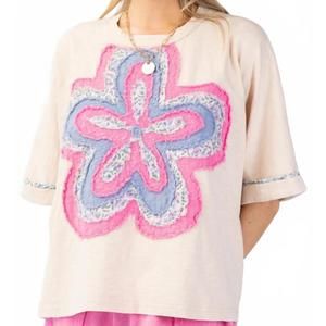 Meet the Flower Patch Top by Easel, crafted for the boho chic in you. This cream short sleeve tee features a relaxed and loose fit, highlighted by wide sleeves and a crew neckline. It's made from 100% cotton knit with a mineral wash, featuring a unique raised and layered front flower patch with pattern detailing on the patches and sleeves. Closure type: Pull on. Small measurements are 23" in length and a 31.5" bust. Perfect for spring vacations, this top adds a chic touch to any casual outfit.