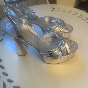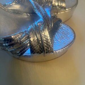 Shimmering metallic silver brand new without tags heels with a chic strappy design. Perfect for adding glamour to any outfit.