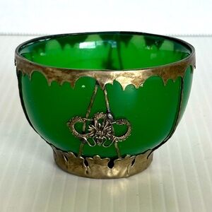 Chinese Green jade colored glass Bowls Metal Mount with Dragon & Phoenix vintage