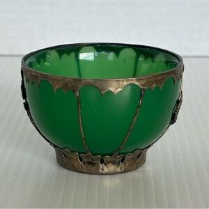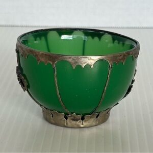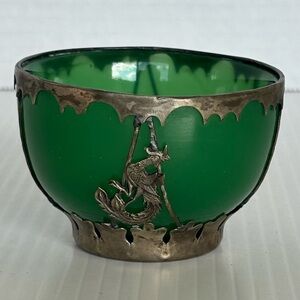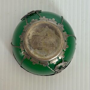 Vintage Chinese Jade Colored Glass Bowl with metal mount and dragon and phoenix (I think) characters. There used to be some discoloration on the bottom metal as photographed but otherwise in very good vintage condition, no chips or cracks. Previous owner shared with me that this was purchased in China during her travels and she kept a glass reversed hand painted globe in it which I have listed in my other listings. Measures 2x3.