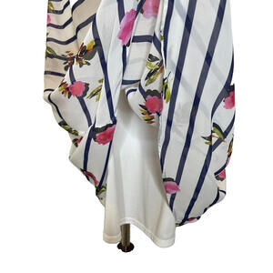 Add some flirty fun to your wardrobe with this beautiful Betsey Johnson halter tank mini dress. The floral and striped pattern in white, pink, and black is perfect for any occasion, from travel to weddings to casual outings. The dress features a zip closure and is made of lightweight, lined polyester that requires dry cleaning only. Ideal for spring and summer, this sleeveless dress with a short length and A-line silhouette is perfect for showing off your style. The dress is available in size 14 and is a regular fit. The dress's brand is Betsey Johnson, perfect for those looking for a unique and stylish look.