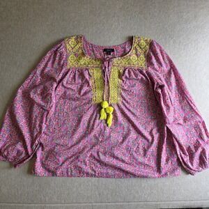 J Crew Peasant Top Sz XL Pink Embroidered Paisley Boho Hippie Festival Blouse