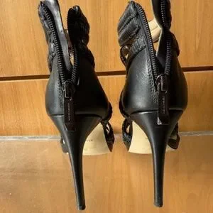 This is a pair of pre-loved BCBG Max Azria black gladiator style leather high heeled sandals in size 6.5. Worn once, and gorgeous - but I'm not going to lie... these are more for looking great in than actually walking far or dancing. Unless you are used to this. Heel is 4.5", which for me is just too much. Leather is gorgeous and braided. They originally cost a fortune. I'm actually struggling to let these go because they are so beautiful, but I just haven't worn them and seriously, am getting too old for shoes like this. Sigh.