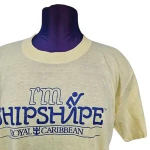 Features vintage 80's Royal Caribbean Cruise Line souvenir tee-shirt, single stitch, bright yellow with blue front graphic "I'm In ShipShape Royal Caribbean", crew neck, short sleeve, lightweight, vacation, cruise memorabilia.
