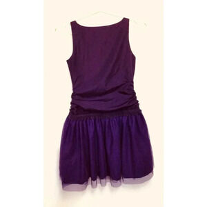 This is a pre-owned purple dress by the brand "C&C." It is size 14 and made of 100% polyester. The dress has a sleeveless design with a V-neckline. The bodice is fitted and the skirt is a layered tulle. The dress measures approximately 34 inches in length, 17 inches across the shoulders, and 16 inches across the bust. The dress is in good condition with no visible imperfections. The care instructions are as follows: machine wash cold gentle cycle, wash with like colors, do not bleach, tumble dry low, cool iron if needed.