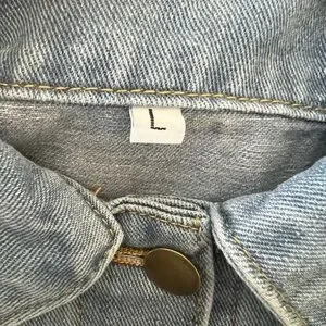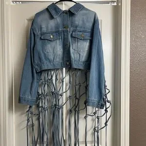 Trendy blue denim jacket with unique fringe detailing. Perfect for a chic look. Never worn.