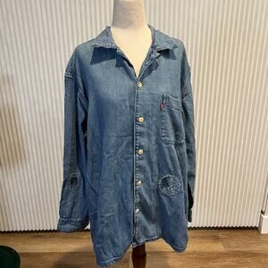 Collared. Button front closure. Patchwork details. Long sleeves. Buttoned cuffs.