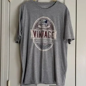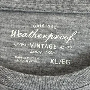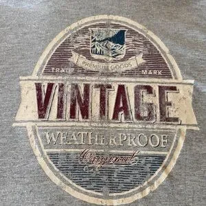 Casual and comfortable Weatherproof Vintage T-shirt in heather gray. Features a large distressed front graphic with “Vintage Weatherproof” mountain logo design. Soft and breathable cotton/poly blend with classic crew neckline and short sleeves.