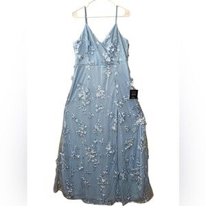 Chic light blue maxi dress with 3D floral accents. Features a stylish slit and delicate straps. Ideal for elegant occasions,Size XL,New With Tag, measures 51 inches long,Open to Offers