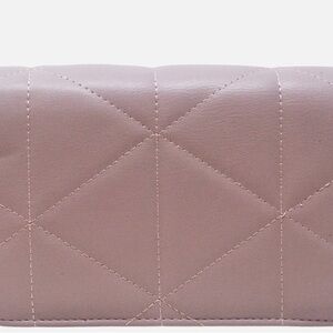 Simple show-stopping style. This flap closure crossbody features a diamond quilting design with gold rhinestone logo with a detachable braided chain.