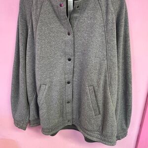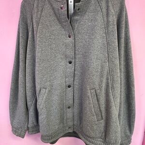 Stylish gray varsity jacket. Features button closure and side pockets. Comfortable and versatile.