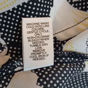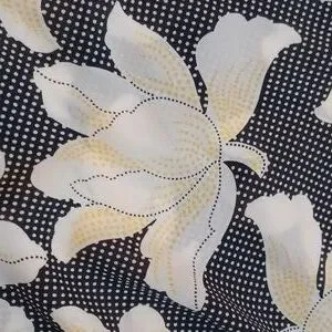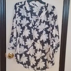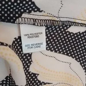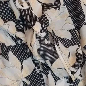 Stylish floral V-neck blouse with a floral design of white and yellow flowers on a black polka dot background. Has 3/4 sleeves you can leave buttoned up or down, slightly sheer with a notched neckline, Hi -Low hemline, fabric does not stretch. Excellent condition size L.