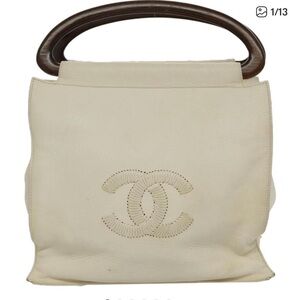 Chic Chanel shoulder bag in cream leather. Features a stylish brown handle. Iconic design for versatile use.