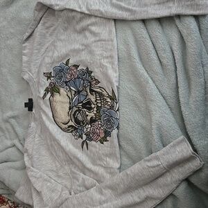 Gray sweatshirt with skull and floral pattern. Features subtle color accents, with rhinestones bling. lightweight. size 2