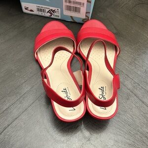 A touch of snake print and a stretch strap give this chic wedge sandal a comfy yet dressy feel. Faux leather upper with an open toe, slip-on fit, heel slingback strap, stretch gore ankle strap, and snake print accent.