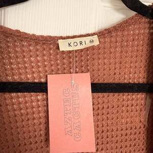 This Kori brand Moody Waffle Knit Cardigan in a rich rust color is a versatile layering piece for any wardrobe. Featuring an open-front design and a comfortable loose fit, it's perfect for transitioning through seasons. The waffle knit texture adds visual interest and a cozy feel. This cardigan is new with tags, ensuring it's in pristine condition and ready to be an everyday essential.