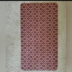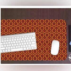 The Shining, Overlook Hotel inspired desk mat. The top of the desk mat is a hand-washable fabric and features a rubber bottom so it won't slip around. The desk mats are dye sublimation printed, which means they have fade-proof, lifelike images. 12" Tall x 22" Wide x 1/16" Thick. In great used condition.