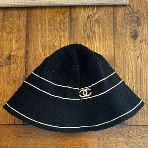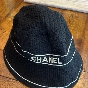 Elegant bucket hat with CHANEL logo. Features white detailing on black fabric. From DHgate. Never been worn before.