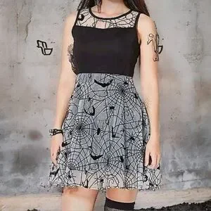 The Spirit Halloween Fit & Flare Dress in size Large is a perfect choice for those looking for a stylish and unique outfit for Halloween or a cosplay event. This sleeveless dress features a round neck, a zip closure, and a black color with a pattern of bats and spiders, ideal for a goth or punk-inspired look. Made from a blend of nylon and rayon, this short dress exudes a sexy and edgy vibe, perfect for parties or clubwear occasions. Add a touch of horror-themed flair to your wardrobe with this charming and attention-grabbing piece from Spirit Halloween.