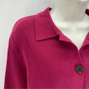 Magenta/maroon cardigan/jacket, dark brown buttons down front, 2 pockets, long sleeves, 100% cotton