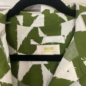 Chic dress with an olive and white abstract design. Features a classic collar and button-up style.