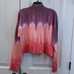 Stylish sweatshirt with a quarter-zip design. Features a blend of purple, pink, and white tie-dye. Perfect for everyday comfort.