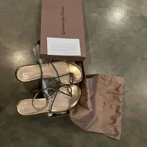 Gianvito Rossi flat sandals, featuring green gemstone embellishments on a metallic gold-effect leather base. Stunning strappy shoe and very comfortable. Condition is like new (only worn once). Size is 39.5. Comes in original box with dust bag