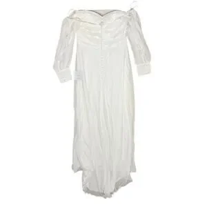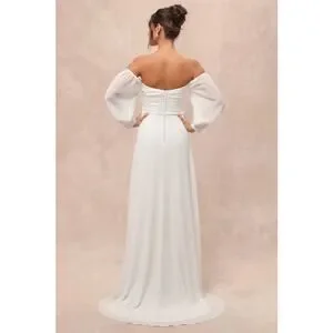 Make way for an abundance of compliments, because the Lulus Adorna White Off-the-Shoulder Maxi Dress will guarantee that your big day is full of them! Airy woven chiffon shapes a draping, gathered bodice with an off-the-shoulder neckline, hidden no-slip strips, and lightly padded cups, all framed by semi-sheer long sleeves with elastic at the shoulders and button cuffs. The high, fitted waist tops an effortlessly flowy A-line skirt that falls to a sweeping maxi hem with a flirty side slit. A subtle train, a row of decorative covered buttons, and a hidden zipper/clasp accent the back to complete the look.