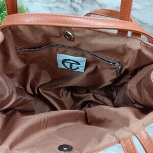 Featuring a double strap (handles and cross-body straps), embossed logo, a main compartment with magnetic snap closure and internal zipper pocket. Made from faux leather and twill lining.