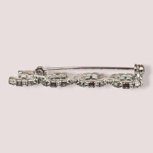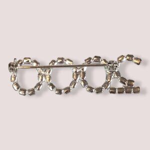 This vintage brooch is made of a silver tone metal and has a modern locking c pin closure. The brooch spells out "2000" and the front is covered in white rhinestones. There are no missing stones, though they may not be as shiny as they were 25 years ago. The brooch has normal wear throughout, but no issues affecting wearability.