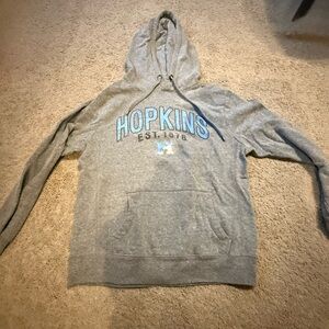 Comfortable gray hoodie featuring 'Hopkins' print. Includes a front pocket and hood.