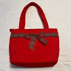 Festive holiday purse and matching wallet. Quilted with red plaid bow. In good gently used condition. See pictures for measurements.