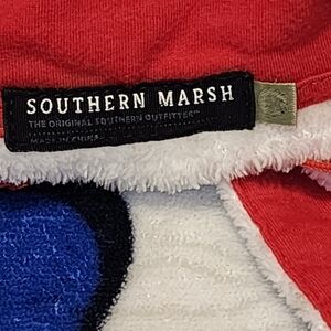 The Southern Marsh Aspen Backcountry Ski Pullover is a patriotic-themed fleece jacket featuring a design of skis. It comes in a size XL ( there is no size tag but Google told me that is what the pit to pit measurements are for! With a red, white, and blue color scheme, making it ideal for those who enjoy skiing. The pullover style with a 1/4 zip and sherpa lining provides both comfort and functionality, ensuring you stay warm and stylish on the slopes. Made by the brand Southern Marsh, this jacket combines a unique design with practical features for a winter sports enthusiast