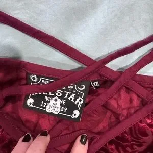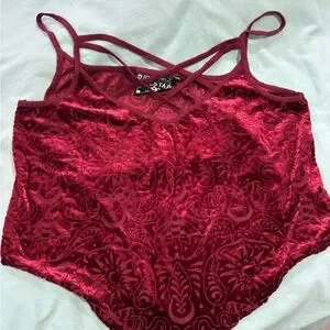Luxurious crimson velvet chemise with intricate patterns. Offers a stylish and comfortable fit. Never worn.